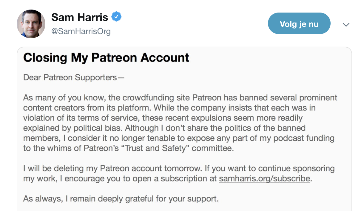 Sam Harris sluit Patreon na verwijdering Sargon of Akkad, Peterson lanceert alternatief platform