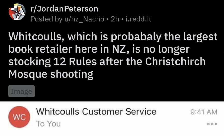 Boekenhandel Whitcoulls haalt '12 Rules for Life' uit de schappen. We zullen de regel die het vermoorden van 50 onschuldige medelanders dicteert wel weer even over het hoofd gezien dan, of zo.