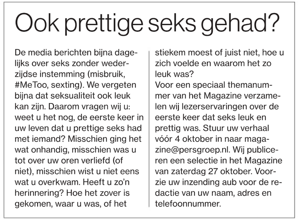 "De media berichten bijna dagelijks over seks zonder wederzijdse instemming" en met 'de media' doelt het Algemeen Daggerblad vooral op zichzelf; zo staat er op dezelfde pagina als de oproep weer eens een stukje inkopkopij van Nynke de Jong over #metoo. Enfin, het AD is reuzebenieuwd naar uw knallende kwintetten en verbazingwekkende verdwijningen. Prikkelend coïtusproza kan derhalve naar magazine@persgroep.nl en zet redactie@geenstijl.nl effe in de cc 🍆🍆🍆 Beste inzendingen krijgen een eervolle vermelding.