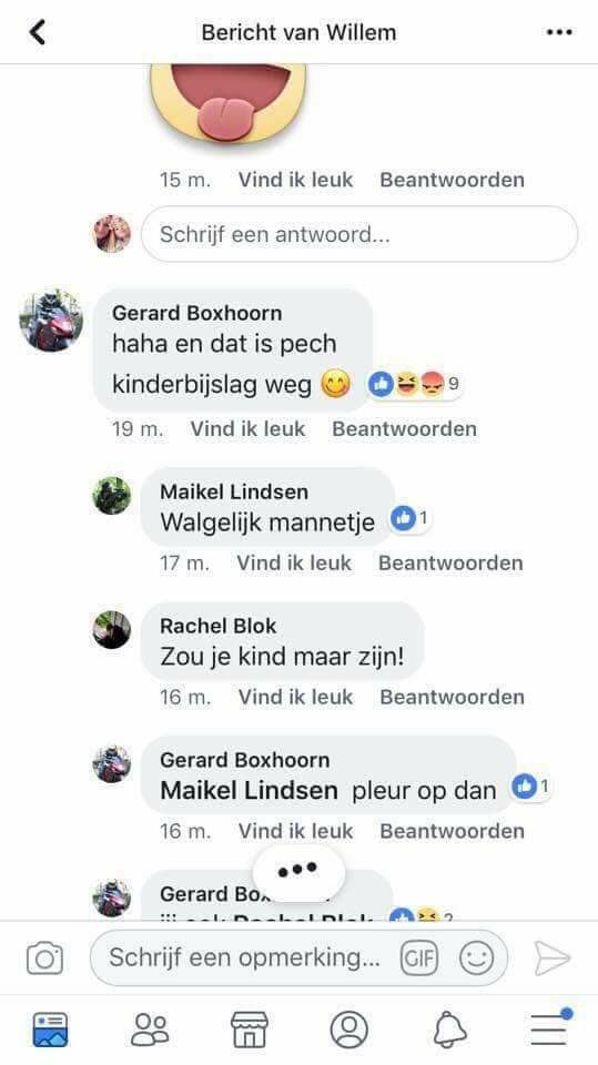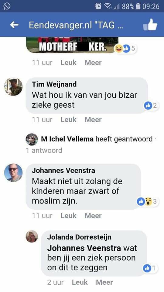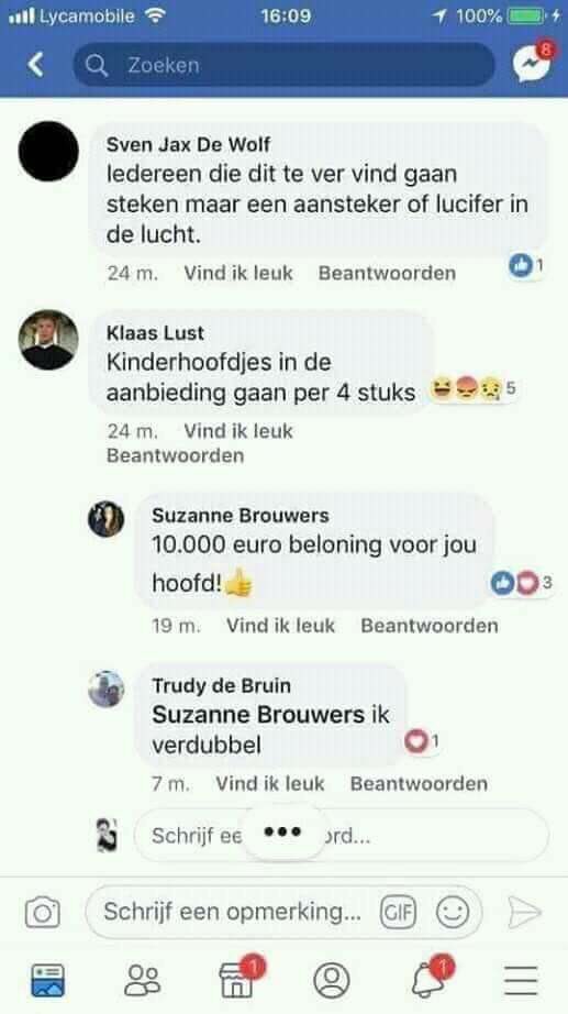 De bovenstaande zojuist verwijderde openbare Facebook-collectie van zo'n 20 screenshots van mensen die zich even wilden laten gelden tijdens het drama in Oss, heeft op sociale media geleid tot wat de Persgroep een "enorme heksenjacht" noemt. Alle screenshots uit de verwijderde post, na de breek. "Op sociale media is een enorme heksenjacht gaande op tientallen mensen die grappen plaatsen over de slachtoffertjes van het spoorongeluk in Oss. Sommigen van hen voelen zich zo bedreigd dat ze hun account verwijderen. De politie roept de 'jagers' op om niet voor eigen rechter te spelen." Maar daar stopt het niet. Zoals ook in de bovenstaande screenshots te zien is worden links en rechts werkgevers gemaild en heeft dit al tot meerdere ontslagen geleid. We weten het nooit zo goed. Er gebeurt iets extreem heftigs en sommige mensen kunnen dan blijkbaar niet anders dan hun eigen algehele ontoereikendheid etaleren door eventjes uit te willen blinken in laconieke grofheid. En dan rijst de vraag: maakt dit het leed van de nabestaanden en families nóg groter dan het al was, of zijn het vooral de commenters zelf die hier echt verliezen omdat ze zichzelf zo te kijk zetten? En dan de zogeheten 'jagers' die achter de werkgevers aan gaan. Sommige morele open deuren zijn zó open dat we het niet kunnen helpen niet erg onder de indruk te zijn van de mensen die er demonstratief voor kiezen zich op die heuvel te laten gelden. Maar wat maakt het allemaal eigenlijk ook uit, laat staan wat wij ergens van denken.