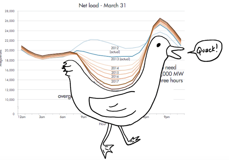 Op een normale dag worden mensen wakker voordat de zon opkomt, en beginnen dan al met een energievraag, die niet duurzaam beantwoord wordt. Tegen de tijd dat de zon wel opkomt, draait de situatie om. Het aanbod van zonne-energie is in Californië al zo groot, dat de resterende energiebehoefte lager is dan 's nachts.