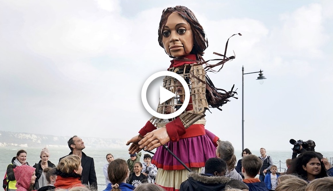 We dachten dat het een Greta-pop was voor iets over het klimaat maar ze heet dus "Little Amal" en is voor iets over vluchtelingen