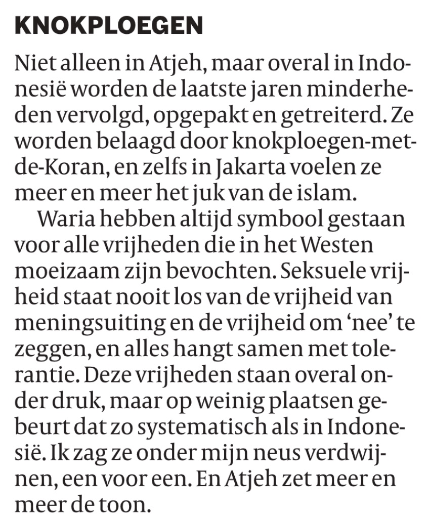 Goedemorgen boerka-vrienden en -vriendinnen! Vandaag - op deze heugelijke regenboogdag - gaan we zometeen straks in vrolijke polonaise door de Amsterdamse gracht om te vieren hoe fantastisch Nederlandje wel niet is voor jan en alleman. En dat allemaal met dank aan wat VOC-bootjes met specerijen uit de Oost, waar Volkskrant-correspondent Michiel Maas na 18 jaar de pijp aan Al-Maarten geeft, in een gitzwart somber afscheidsartikel over een naar de middeleeuwen afglijdend Indonesië. Prettige dag verder!