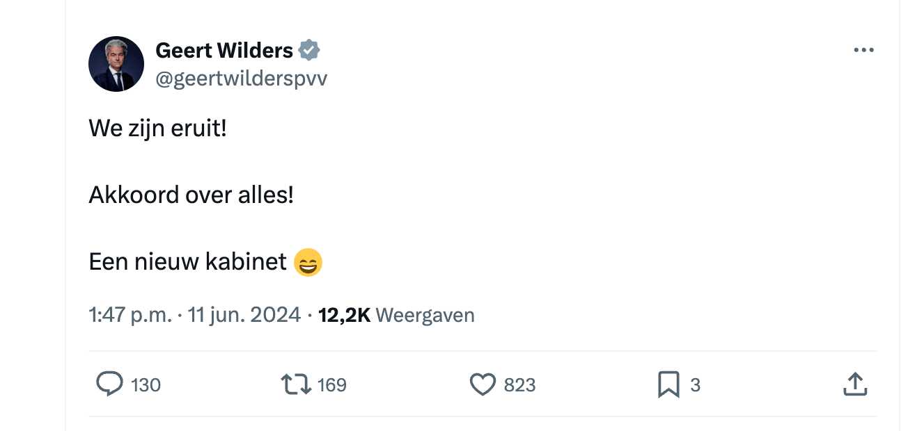 Geert Wilders: "WE ZIJN ERUIT, NIEUW KABINET"