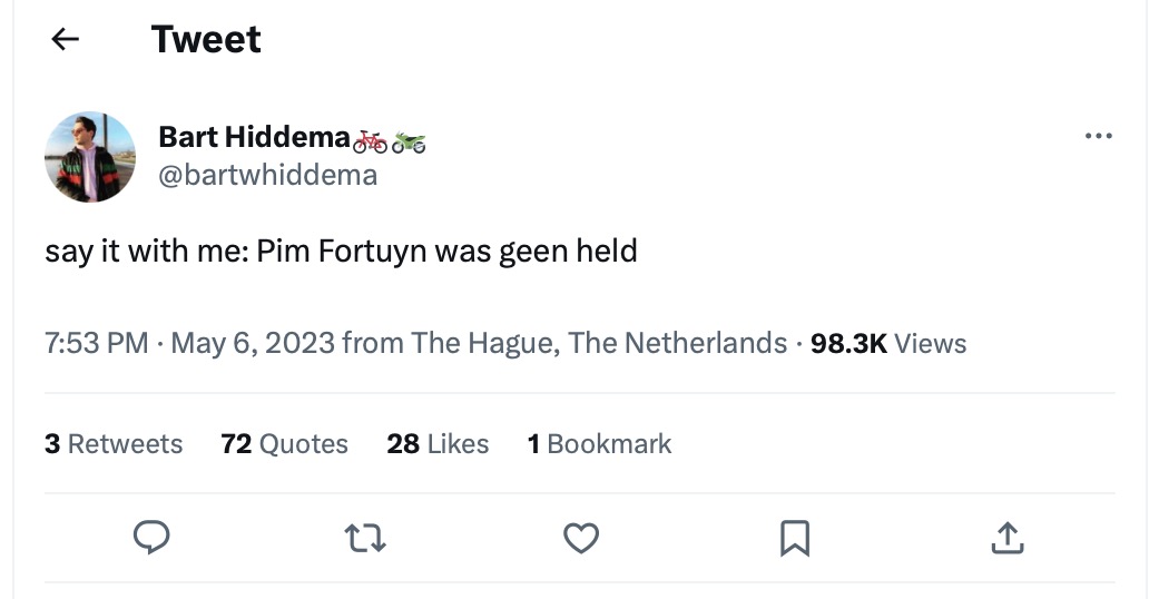 Nou mensen, gefeliciteerd. De domste beeldenstormers komen weer eens uit Nederland. Waar activisten in België massamoordenaar Leopold II van zijn sokkel trekken, komen ze in Rotterdam niet veel verder dan het bekladden van beelden van Witte de With (wiens grootste misdaad zijn naam geweest lijkt te zijn), Piet Hein (die geen slavenhandelaar was) en, opnieuw, Pim Fortuyn. Collectief 'Helden van Nooit' eist de actie op met een van de domste Facebookposts in de geschiedenis van dingen die heppen gestaan op Facebook (en dat wil wat zeggen). Wij citeren: "De seksuele vrijheden waar de hedendaagse Nederlandse politiek zo trots op is, zijn onlosmakelijk verbonden geraakt met racisme, anti-immigratiebeleid en nationalisme. LPF-frontman Pim Fortuyn is het bekendste voorbeeld van dergelijk homonationalisme. De LHBTI-gemeenschap en het vrouwenbelang doen er voor rechtse politici alleen toe wanneer zij de oorzaak van problemen in onze maatschappij op mensen met migratieachtergrond willen schuiven." Maar natuurlijk. Alsof de LHBTI-gemeenschap er voor Pim Fortuyn niet toe deed toen hij er zijn hele volwassen leven lang, totdat hij werd afgeslacht door een linkse activist die dankzij een stel laffe rechters alweer vrij rondloopt, deel van uitmaakte. Ga je mond spoelen, gajes.