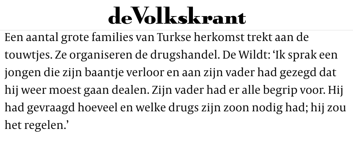 Schitterend verhaal weer in het Volkskrantje. Hoe de realiteit met de botte knie beukt in de gorgelende nek van de inclusieve samenleving. Criminele Turkse familie-clans hebben het voor het zeggen in Poelenburg, Zaanstad en de veelgehoorde sjakie-kreet jE MoEt De OuDeRS AaNsPreKEN!!! heeft ook geen enkele zin meer. De burgemeesters politici van de SBS Probleemwijken slaan weer eens alarm, en schreeuwen maar weer eens om MILJARDEN. Zoals ze dat ook al deden in 2003 en 2005 en 2006 en 2007 en 2012 en 2018. Kortom; aanpak werkt al 20 jaar niet, want probleemwijken gonna probleemwijk. En het is niet de schuld van de Rabobank. Het is de schuld van de multicultuur. Platgooien die wijken en er zonneparken van maken.