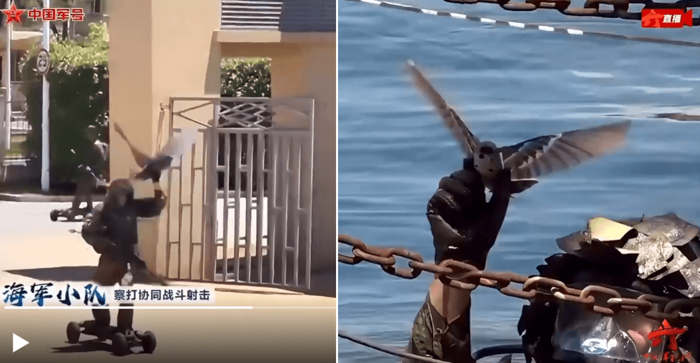 Video's: Chinese 'Zeedraak Commando's' met vogel-drones op elektrische skateboards in het Stamcafé