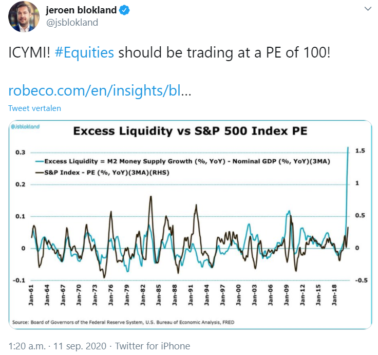 Dit is natuurlijk waanzin, maar één die gedreven is vanuit de obligatiemarkt. En die markt is weer gedreven door de centrale banken en overheden. Waar het dan nu ook op neerkomt is dat slecht nieuws gezien wordt als goed nieuws door financiële markten. Immers, slecht nieuws leidt tot nog meer ingrijpen (steunpakketten en dus liquiditeit) wat de koersen nog hoger zal zetten (door het flow effect).