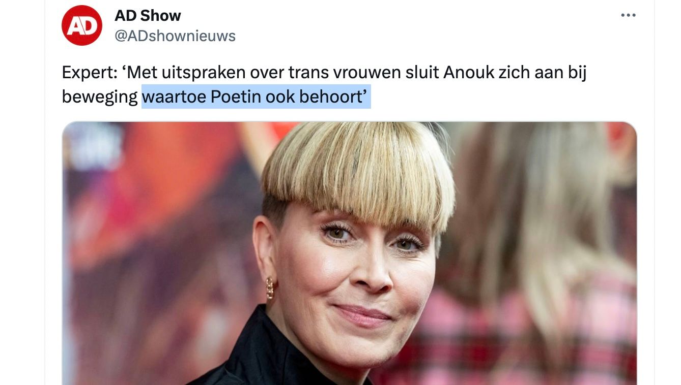 Een UvA-sociologe/genderexpert in het Algemeen Dagblad over Anouks 'transfobie' met "POETIN" in de kop. Daar gaat de moderne man even voor zitten