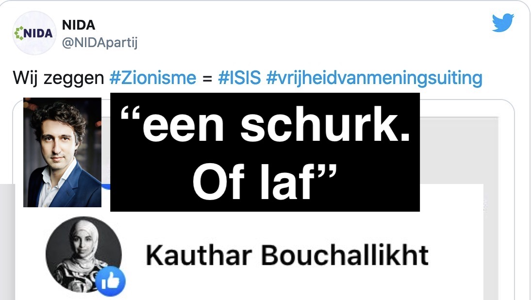 Weet u nog, 2018? Wat was dat lang geleden hè, 2018. Kauthar Bouchallikht, die wij inmiddels zo goed kennen, was nog een jonge naïeve student activist van 24 en GroenLinks had ruzie met de islamisten van NIDA. Jesse Klaver (toen nog politiek leider van GroenLinks, tegenwoordig politiek leider van GroenLinks, red.) eiste bij het politiek café van Libelle dat NIDA afstand nam van een tweet waarin Israël met de nazi's ISIS werd vergeleken. NIDA weigerde dat en leider Nourdin el Ouali ging op de nationale televisie vertellen waarom het prima is om Israël met ISIS te vergelijken.