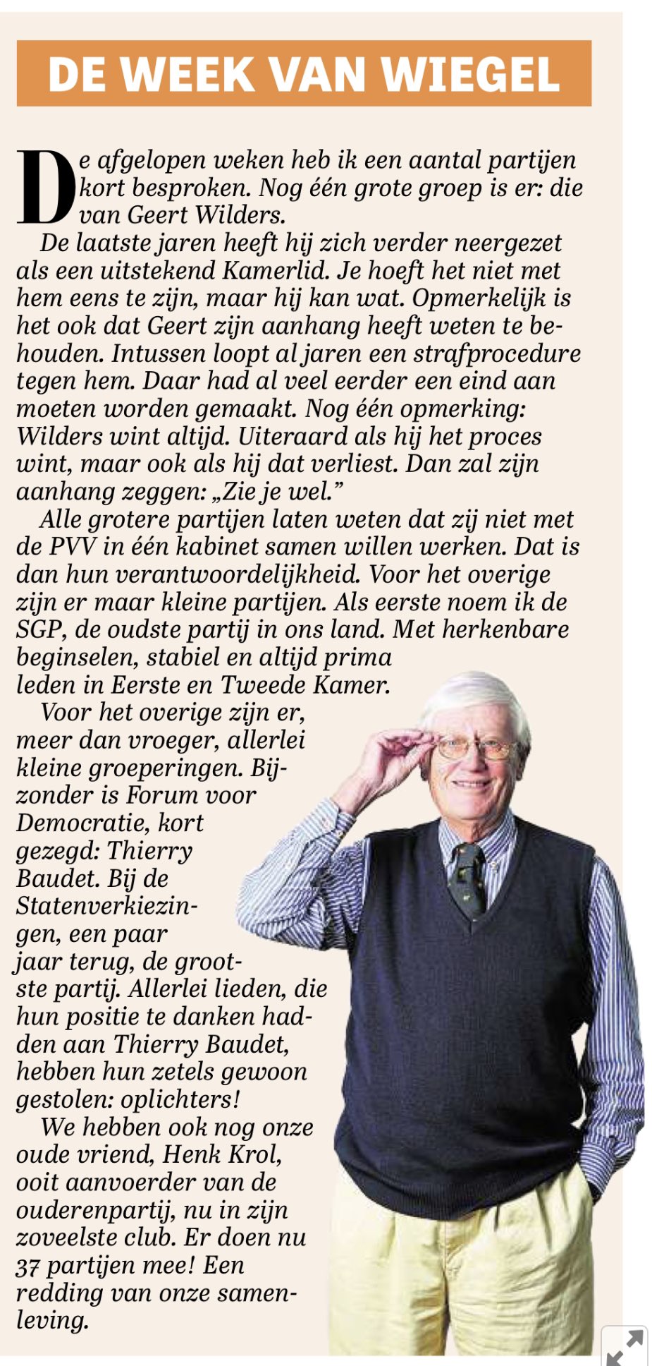 Landgenoten. U moet er nu ernstige rekening mede gaan houden dat de verkiezingen van 17 maart aanstaande uitgesteld gaan worden. Als Het Liberale Geweten der VVD in de VVD-krant des Vaderlands gaat bazuinen dat Geert Wilders de tofste peer in de parlementaire fruitschaal is, dan zijn de rapen wel gaar voor de Ollongroïden in Dit Land. (De List zijn ze al aan het verzinnen, en die heet RIVM.) Opmerkelijke shout-out ook van Hansie naar Thierry en Zijn 40 Zetelrovers. Want Wilders roofde ooit zijn zetel van de VVD. Aap uit de mouw, na de break.