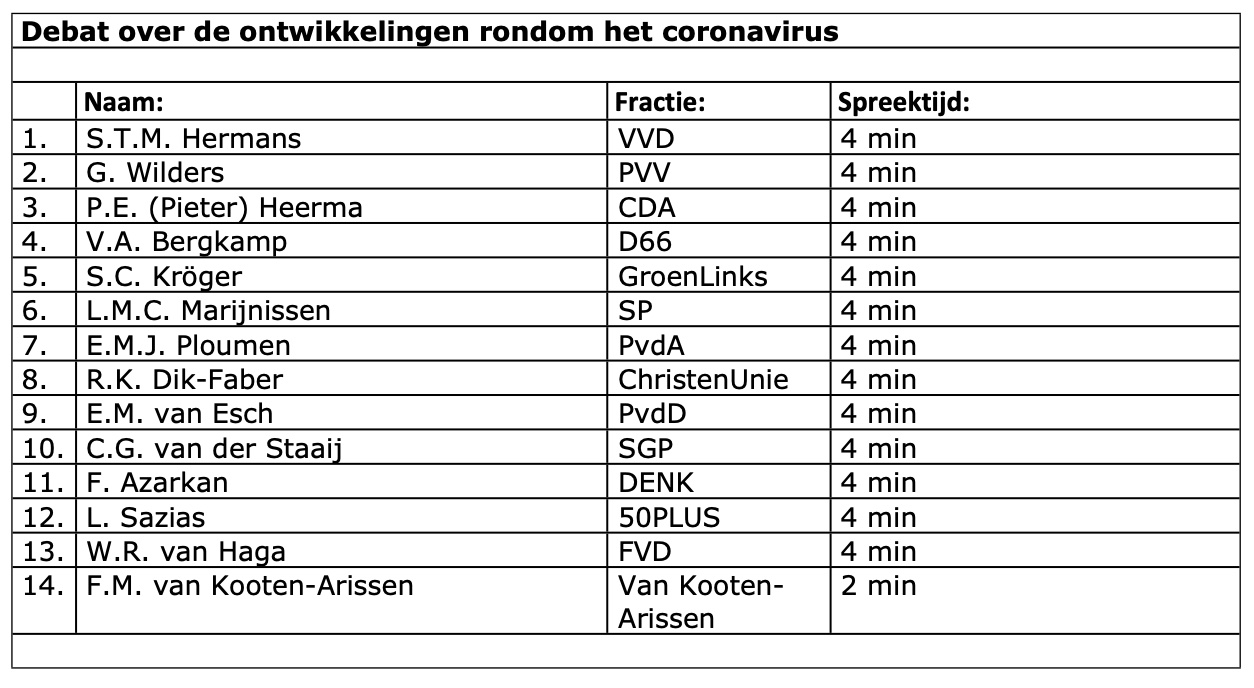 Timing hoor. Debat laten beginnen du moment dat de RIVM-cijfers van vandaag binnen zijn. Oké, Mark, Hugo en Ferd hebben ze al om 10:00 uur, maar wij the people krijgen ze pas om 15:15 uur. EN ZE GAAN WEER NIET DE GOEDE KANT OP. We gokken op heel veel foto's van een driftig gebarende Geert Wilders, een koffieleutende Hugo, lachende Rutte, een stuurs kijkende Grapperhaus en nog iemand. Zeg maar de foto's die we al een jaar zien. Een jaar, is het alweer zo lang geleden? Yep. Vorig jaar op deze dag hadden we +811 positieve testen en 63 overlijdens. Wat wel nieuw is; Klaas Dijkhoff is foetsie, nu hebben we Sophie Hermans.