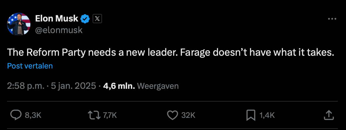 Musk: Nigel Farage moet oppleuren
