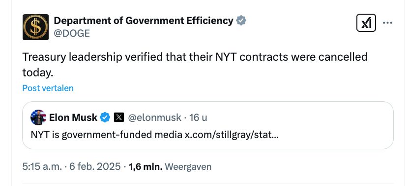 NEE Elon. Regering VS gaf vanaf 2021 niet opeens 'tientallen miljoenen' aan New York Times