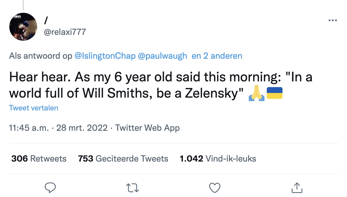 Will Smith heeft Chris Rock geslagen en daarna nog eens duchtig dreigend toegesproken omdat meneer Rock een grapje over het kapsel van mevrouw Smith Jada Pinkett maakte. Wat een spektakel! Wat een show! This is Hollywood! Where the magic happens! The show must go on! En Sean Penn wilde nog wel wegblijven als Zelenski niet mocht komen spreken! Wij kijken ook al jaren niet meer wegens gaapsaaie woke-crack van schijnwereldmiljonairs die echtewereldmensen te veel lessen proberen te lezen. Kennelijk grijpt de Academy naar kunstgrepen door een comedian door een halfserieuze acteur op de bakkes te laten sletmeppen, diezelfde acteur daarna een Oscar te geven voor een koningsrol om die vervolgens met betraande excuses te aanvaarden. There's no business, like show business! Nou, gedoe allemaal en veel grappen natuurlijk. Wij gaan weer gewoon de hond uitlaten, koffie drinken en aan het werk.