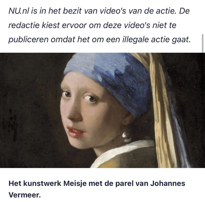 Instant Update: "Onbevestigde bronnen die op dit moment in het Mauritshuis aanwezig zijn laten zojuist weten dat het Meisje met de parel van Johannes Vermeer is 'besmeurd' door activisten." Mauritshuis afgesloten na mogelijke bekladding kunstwerk. Politie: "In een museum in Den Haag hebben wij zojuist drie personen aangehouden na openlijke geweldpleging tegen goederen. Op dit moment zijn wij hier bezig met sporenonderzoek."