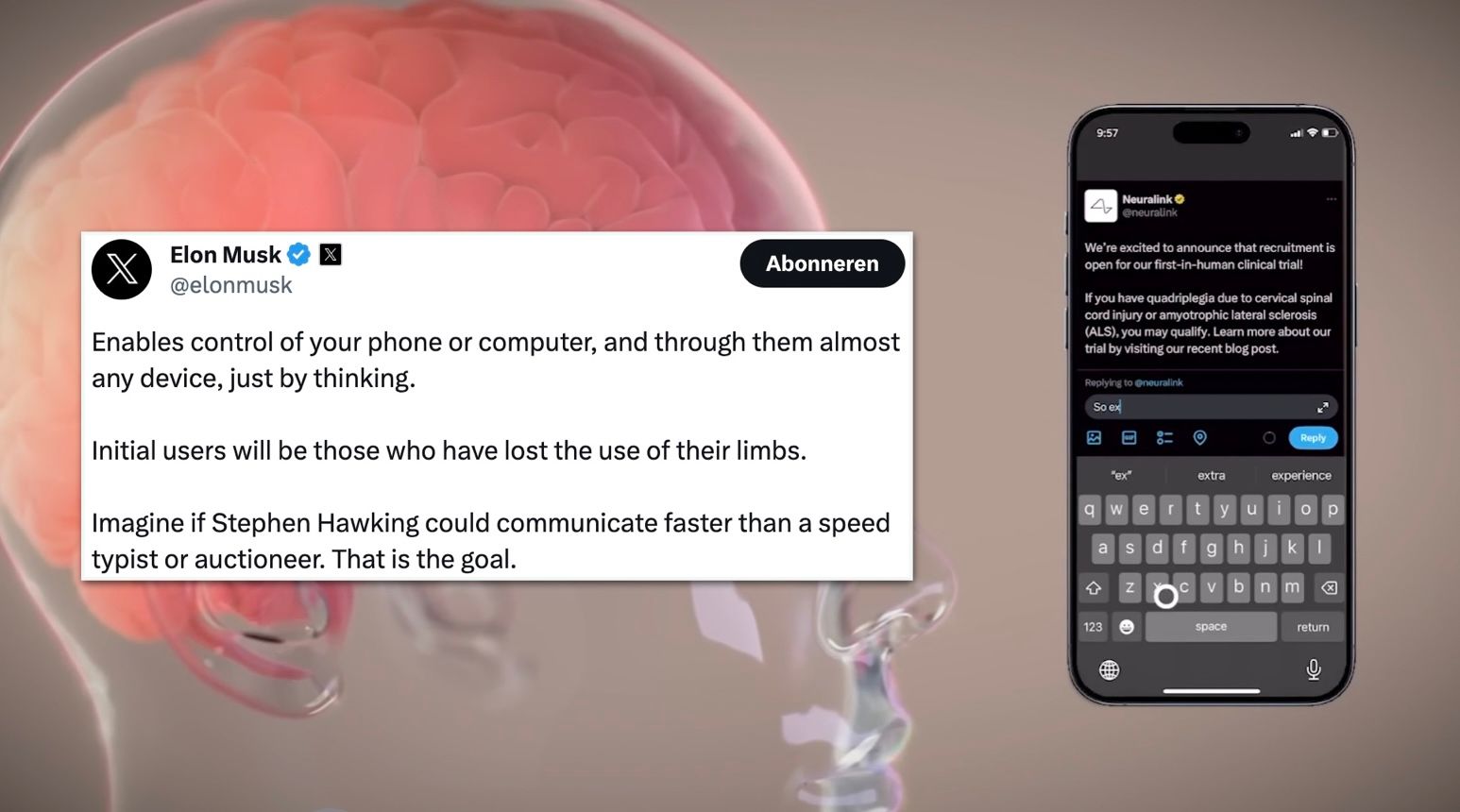 Bovenstaand The Verge's prima samenvatting van een Neuralinks 'Show and Tell' evenement gisteren. Samengevat: Musk zegt dat ze wachten op toestemming van Pfizer/Reuters de FDA en waarschijnlijk binnen zes maanden starten met testen op mensen. Neuralink zegt ongeveer twee doelen te hebben: 1) het herstellen van verloren motorische en cognitieve functies door hersen- en ruggengraatschade en 2) het creëren van een 'interface' tussen hersenen en computers. Dat tweede komt in testen tot nu toe vooral neer op dieren die puur middels hersenactiviteit - dus zonder ledematen - computerfuncties als toetsenborden en spelletjes aansturen.