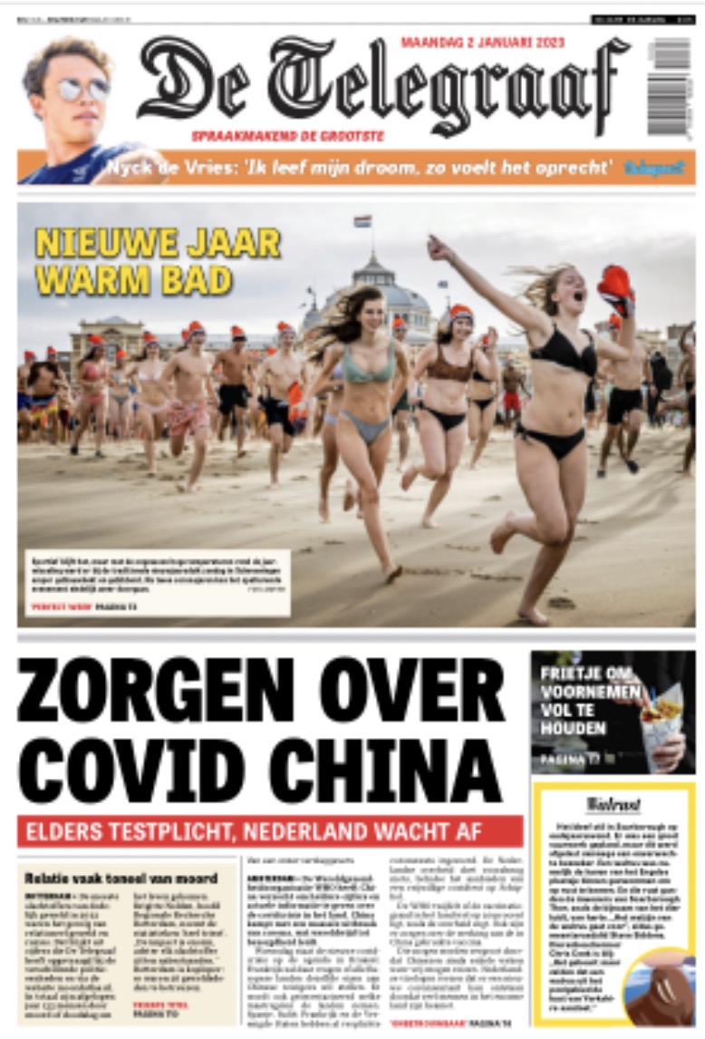Wij sprinten naar de bus natuurlijk. En ja hoor. Wij hadden ze gisteren ook al en toen dacht De Telegraaf: goh laten wij die Unox-girls traditie eens afpakken van De Geenstijls. Maar wat een heerlijke frisse madammen die lijf & vormen riskeren in hun dapp're strijd met de zeespiegelstijging. Alsof ze zo uit À l'ombre des jeunes filles en fleurs gedarteld komen. Hopelijk zijn ze allemaal 18+ want die voorste heeft ondertiet en anders heeft De T. een probleem. En voor de wat serieuzere mensen heeft de Volkskrant natuurlijk ook weer een opbeurende voorpagina. Happy New Year!