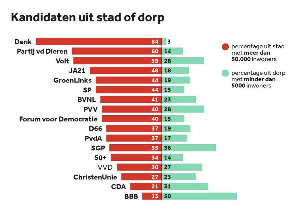 Wie dacht dat de Provinciale Staten Verkiezingen iets met de provincie te maken had. Helaas boerenkaas. Het is voornamelijk randstedelijk richeltuigh dat aan de vierjaarlijkse gemeenschapsgeldtiet probeert te lurken. Sinds deze week zijn alle kandidatenlijsten PS2023 (PDFS) naar demense in hun kieskring gestuurd, en de NOS heeft zitten turven (ze noemen het analyse) waar de huizen van de kandidaten nou helemaal wonen. En wat blijkt. Die wonen in de stad. Er zijn maar 3 partijen (SGP, CDA, BBB) met meer kandidaten uit een dorp dan uit de stad. Ook opmerkelijk. Bij DENK mogen ze dus echt de deur niet uit en de Partij van de Dieren heeft nog nooit een dier van binnen gezien.