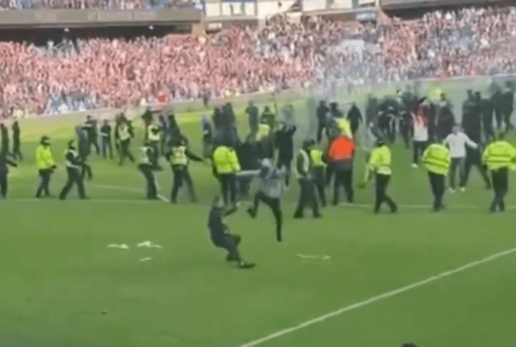 ZIEN. Rangers-fan karatekopschopt Celtic-veldbestormer