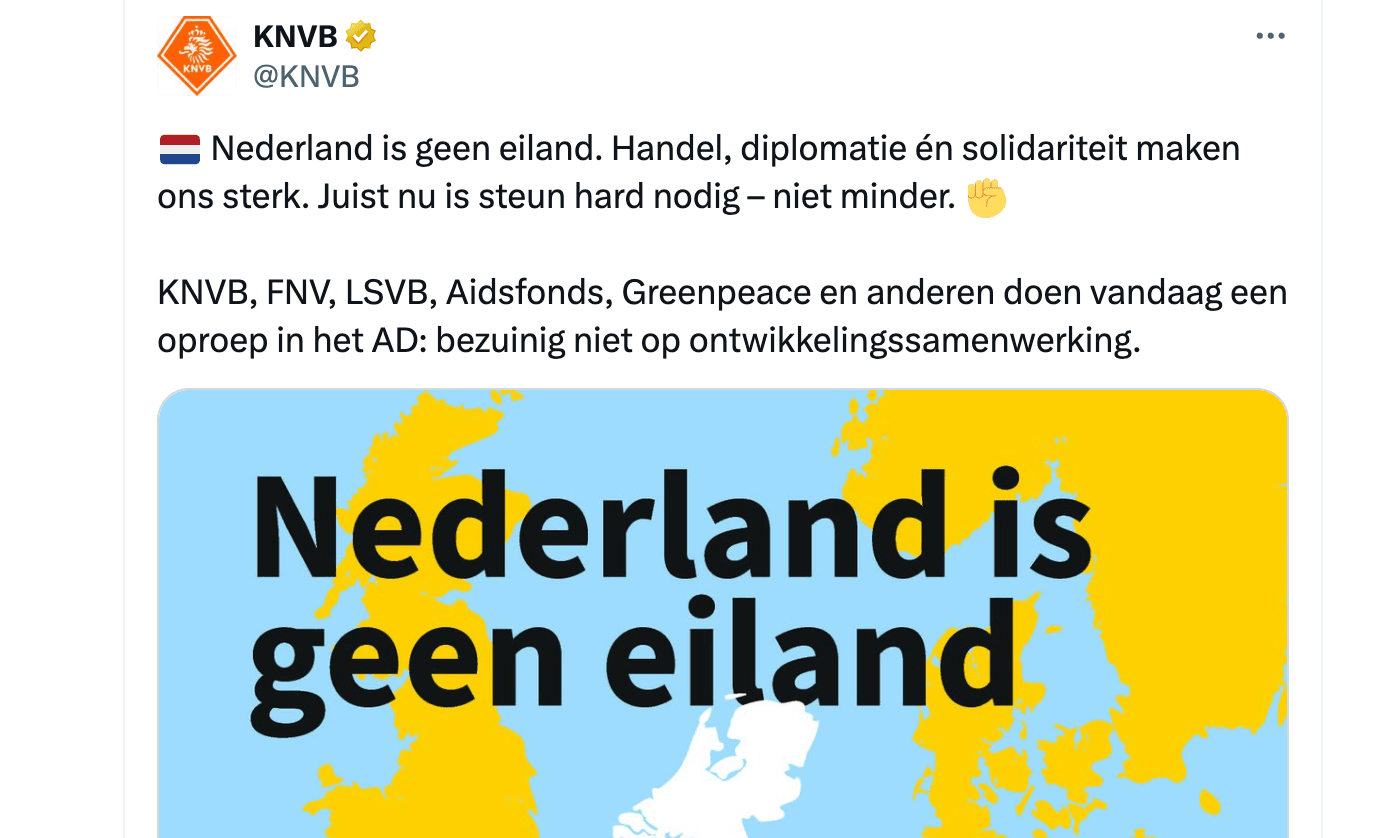 De asielcrisis is duur alsook heel duur, omdat onze opvangcentra vol alsook overvol zitten en onze grenzen poreuzer zijn dan Oekraïense stuwdammen. De miljarden die we tekort komen voor deze prijzige hobby haalt het kabinet, in lijn met Europese regels, deels uit het potje voor ontwikkelingssamenwerking. Geld voor mensen uit arme landen gebruiken om mensen uit arme landen op te vangen is tenslotte best logisch. Dat valt alleen helemaal verkeerd bij de organisaties wiens businessplan volledig uit steun aan mensen uit arme landen bestaat en die denken dat een paar miljard euro aan ontwikkelingshulp enige invloed heeft op de enorme stroom toekomstige medelanders. Om hun woorden kracht bij te zetten zijn enkele bekende Nederlanders opgetrommeld voor zo'n tenenkrommend iedereen-mag-een-zin-zeggen-filmpje, waardoor experts als een Sinterklaasjournaalpresentatrice en een voetbalverslaggever makkelijke deugpunten scoren door zich openlijk te bemoeien met de overheidsbegroting. Alternatieven worden niet geboden, dus we gaan er blind vanuit dat ze liever op onze zorg of ons onderwijs bezuinigen, dan op ontwikkelingshulp. Of toch de uitkeringen verlagen of de NPO afschaffen? Het is makkelijk pleiten voor minder bezuinigingen met je gesponsorde NPO-kop, maar dat geld moet ergens vandaan komen. Dus zeg het maar: Kunstsubsidies afschaffen? De Ter Apelse stoelslapers bij Dolf laten overnachten? Alle asielzoekers op Dieuwertjes pakjesboot terug naar hun eigen land? Kom eens met oplossingen, stelletje opportunistische narcisten.