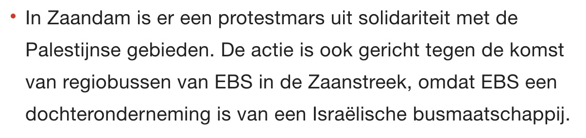 Ook vandaag. Een demonstratie tegen Israëlische bussen van met merk EBS. Vandaag in Zaandam - bekend van de treitervlogger en de kansenwijk Pallieburg - een solidariteitsdemo voor de "Palestijnse Gebieden" (dixit NOS). Dus waarom dan niet ook even het Israëlische busvervoer meenemen in de Day of Regio Rage? Hoe het allemaal precies zit met die verschrikkelijk gemene kolonistenbussen met die grote motorkappen leest u in deze wiki en wie meer wil weten over Knollendam bevelen we deze pagina aan. Veel plezier daaro vandaag, wij zijn werken.