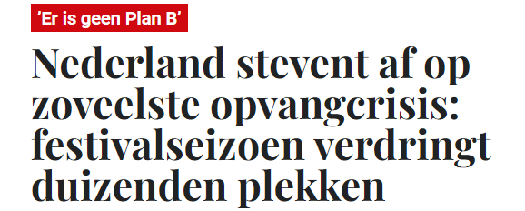 Nu kunt u er donder op zeggen dat er wel gewoon een PLAN B is. In het allergeheimst bijelkaar gekonkelefoezelemoest op de verantwoordelijke ministeries (VVD, D66). En dat is... het festivalseizoen 2024 kunt u op uw witte gedrogeerde jongerenbuik schrijven. Lowlands, Pinkpop, Paaspop, Defqon1, Best Kept Secret, ITGWO, DTRH, Decibel Outdoor, Mysteryland, Zwarte Cross, alles staat de hele zomer vol met witte tenten, portacabins en dieselaggregaten. Tenzij de gewillige Haagse rijksbeulen (die steeds roepen dat de omvolking ook maar een theorie is) er opeens achter komen dat hun Prinsengrachtconcert ook niet doorgaat. Dan zijn de rapen gaar. Fijne zomer!
