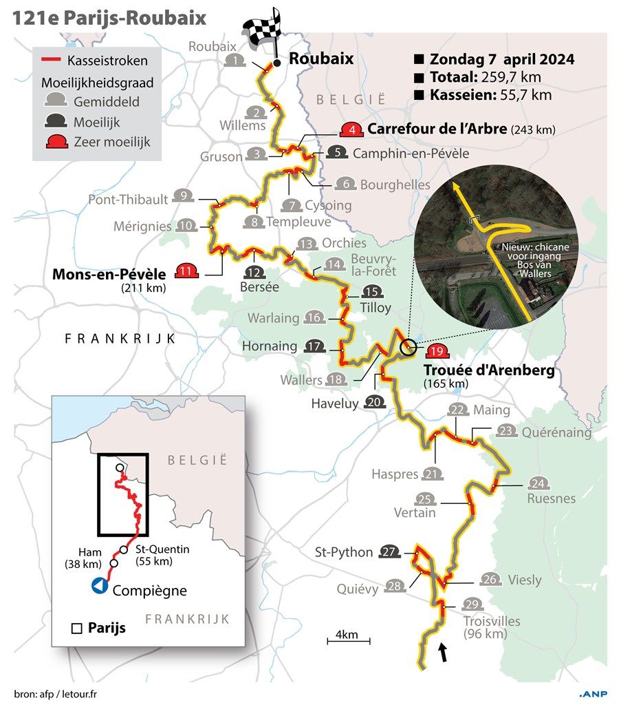 Veel gedoe over de op een na allertofste Klassieker van allemaal: Parijs-Roubaix. Er is een CHICANE voor de beruchte kasseiensectie van het Bos van Wallers gelegd omdat profi wielrenfietsers daar met 70 km/h over de kasseien stuiven en er vrijwel altijd iemand z'n lichaam breekt. Nu vallen er de laatste tijd nogal veel goede wielrenners: Woutje van Aert brak ribben & borstbeen, Vingegaard sleutelbeen & ribben, Remco sleutelbeen & schouderblad, enzovoorts. En dus moet Mathieu van der Poel de winst opeisen na het nemen van een chicane. WAUW! Dat wordt vallen. Oplet-tijden: Haveluy 14.49 uur, Bos van Wallers 14.59 uur, Mons-en-Pévèle 16.00 uur, Carrefour de l'Arbre 16.41 uur.