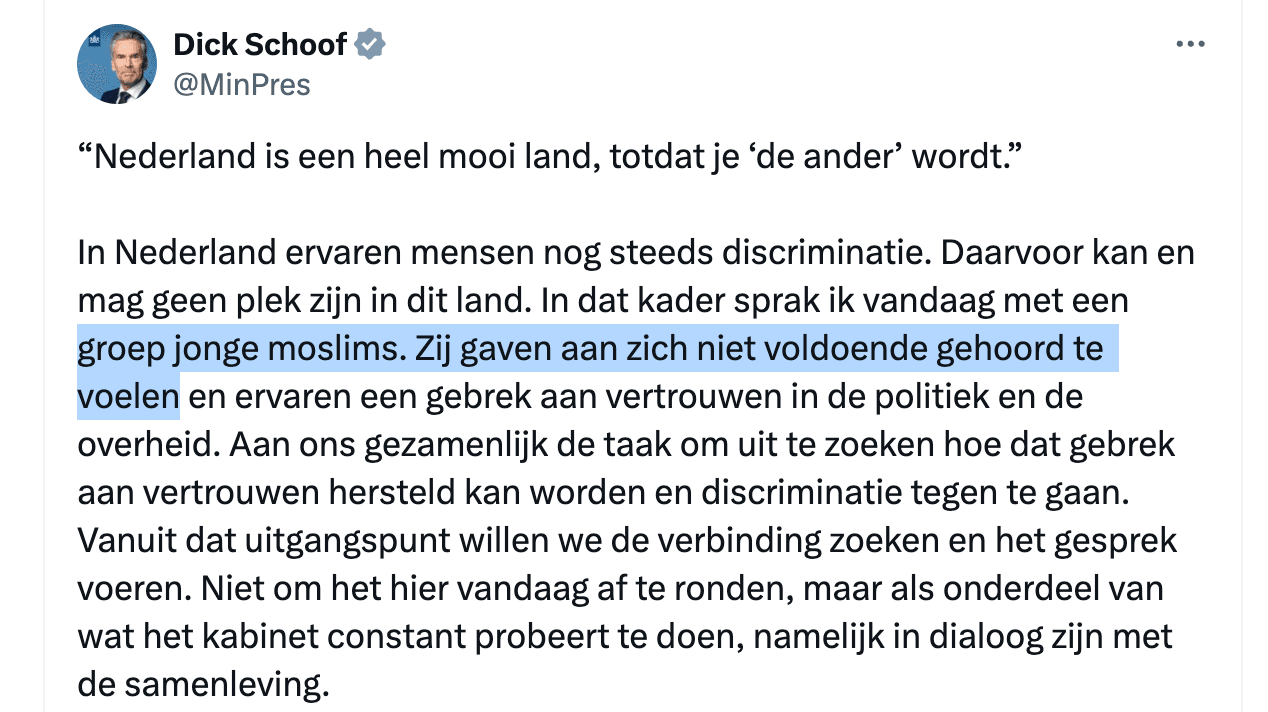 Moslimjongeren vanaf nu elk half jaar in gesprek met kabinet en "MinBuz gaat maatregelen tegen moslimdiscriminatie coördineren"