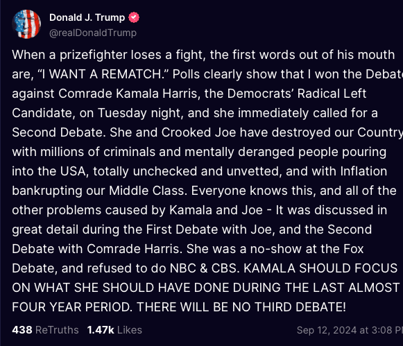 Dat Trump nu claimt het debat van deze week te hebben gewonnen, ligt daar enigszins van in het verlengde. De werkelijkheid was weerbarstiger: meerdere gezaghebbende Republikeinen en Trumpisten erkenden met frisse tegenzin dat dit niet 's mans beste performance was, en dat Kamala Harris er in ieder geval in slaagde de voortgang en het tempo van het gesprek te dicteren. Met behulp van een ouderwets potje trollen slaagde ze er zelfs in het gedeelte van het debat dat over immigratie ging te saboteren. Harris kaapte het onderwerp waarop Trump de verkiezingen kan winnen door te beginnen over rallies en crowd sizes, Trump ging er met boter en suiker in.