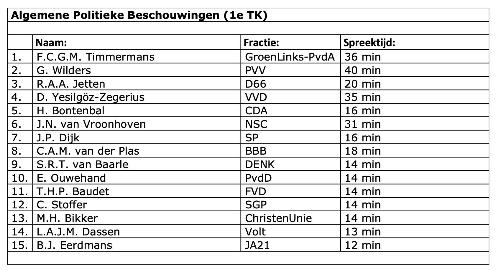 Goedemorgen Nederland! Schakelen we nu rechtstreeks over naar onze Nationale Vergaderzaal in Den Haag voor het jaarlijkse hondengevecht van jewelste. De ABP. Dit jaar is alles anders want we beginnen niet met Geerts Geniale Geweervuur waar we al die jaren zo van genoten hebben. Oh jongens meisjes, wat een feest was dat vroeger; minutenlange tirades van het Venijn uit Venlo richting de "gevestigde polletiek" en de "eeuwigdurende elite". Maar DAS WAR EINMAL. Vanaf vandaag is Greet zelluf gevestigd ende elite en mag de gruwelijke Frans Timmermans als eerste de Greet du Jour uithangen. Inleidende beschietingen gisteravond al in De Telegraaf alwaar Timmermans vierkant achter het asielbeleid (iedereen foetsie) van Schoof I ging staan, kortom dit wordt een links executiepeloton, met een snoepjes uitdelende VVD. ZIN AN!
