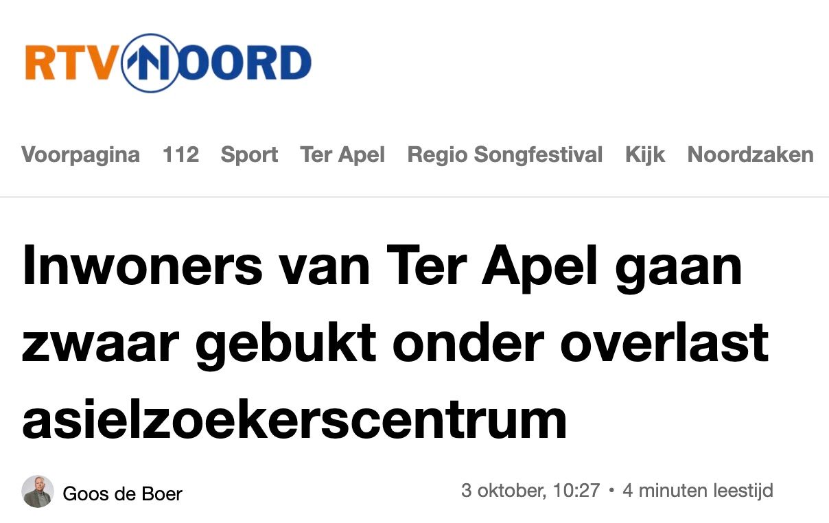 Sinds afgelopen vrijdag staat er op de sympathieke regio-npo RTV Noord een werkelijk vernietigend rapport over De Toestand in Ter Apel sinds de komst van het AZC. Hele dorp naar de klote, niemand wil er nog wonen, lege schappen, bange mevrouwen en een glunderende Miele-dealer alsook een handenwrijvende VeriSure-franchiser. Rapport is van CEBEON, dat lijken ons geen pannenkoeken. Artikel is van Goos de Boer, en da's ook geen pannenkoek want De Boer zit al jaren op het dossier.