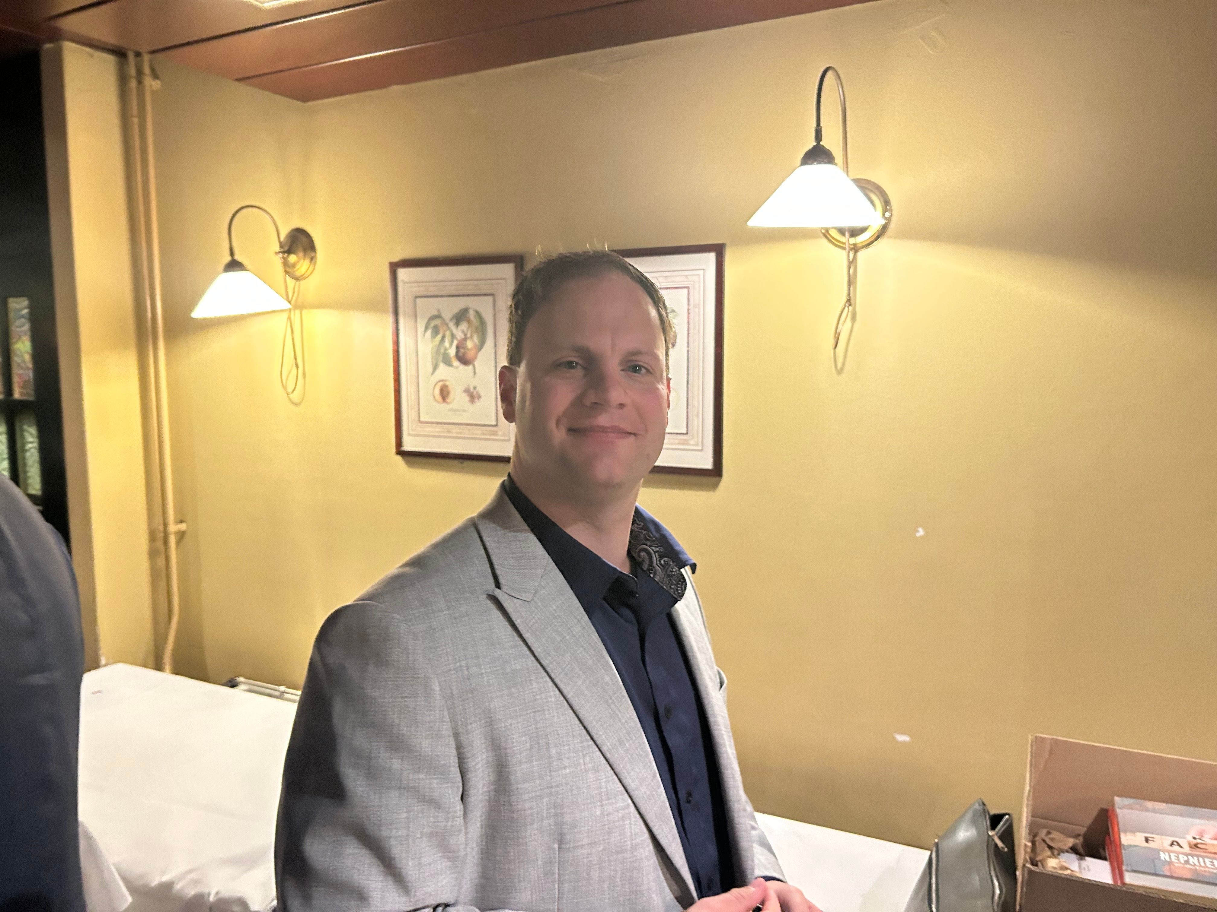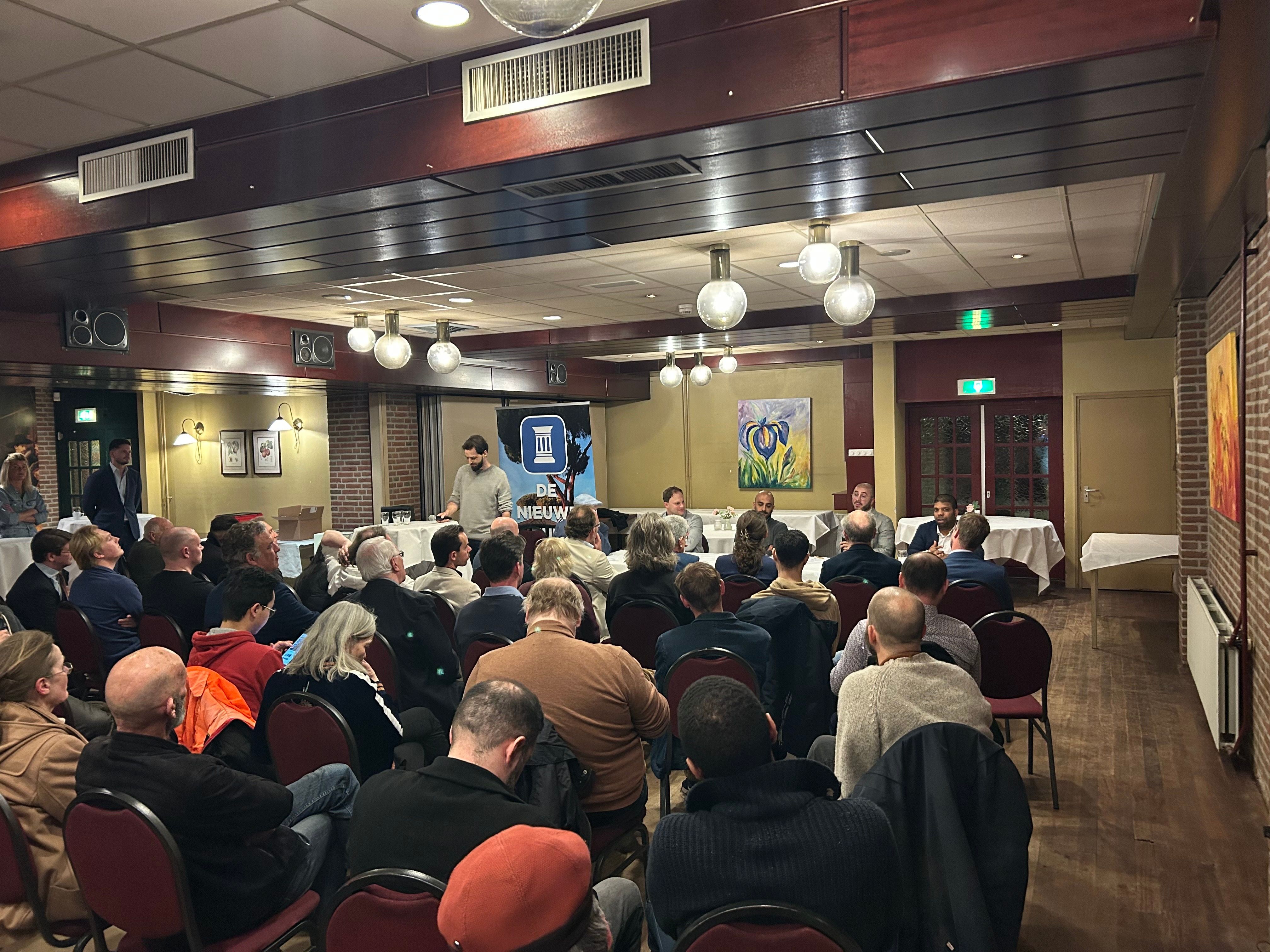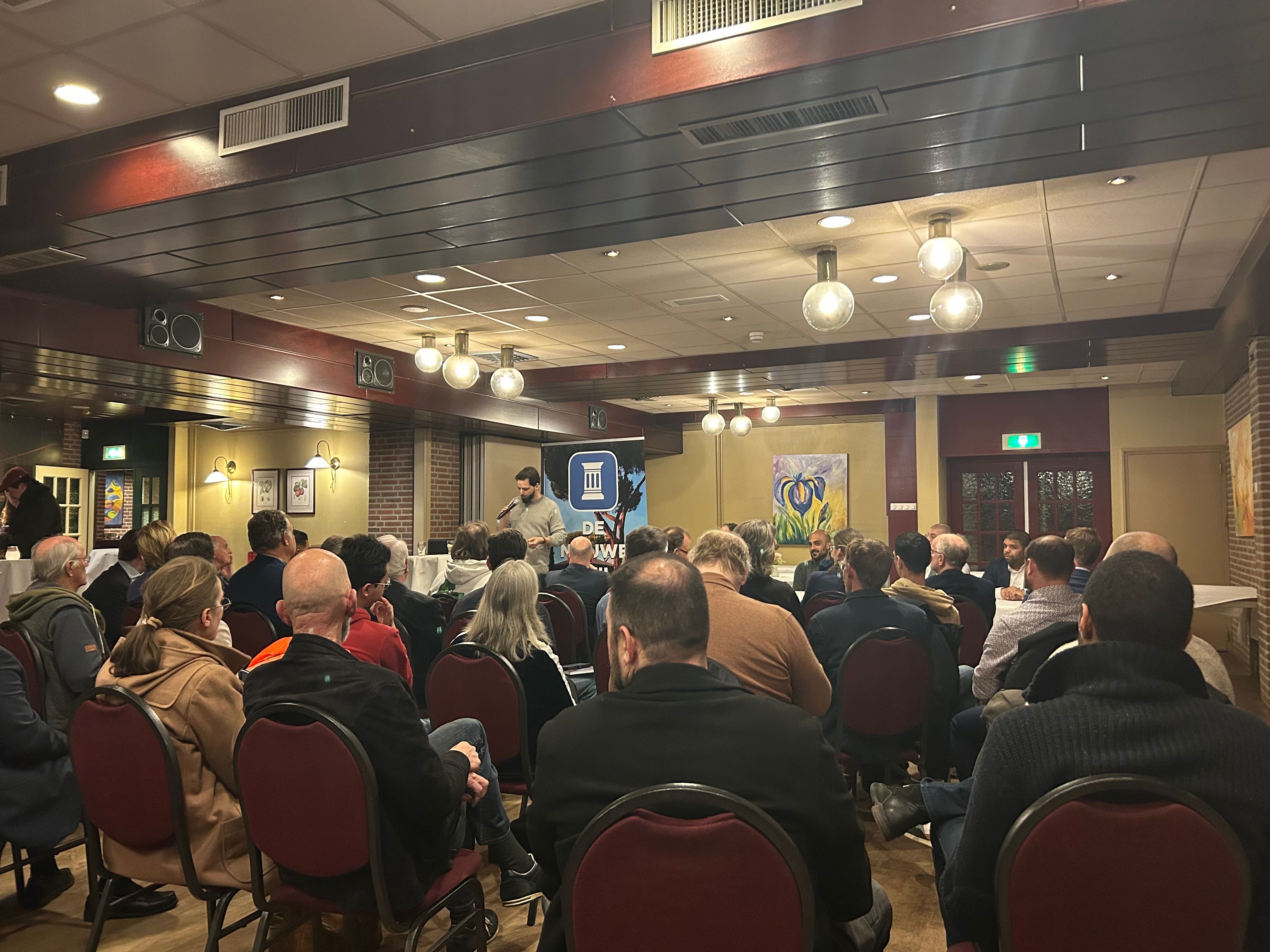 De zaal is goeddeels gevuld met wat er over is van het eens zo beloftevolle FvD, en wat zich inmiddels het best laat typeren als groezelig rechts. Bezoekers begroeten elkaar bij binnenkomst joviaal; dit wereldje is inmiddels zo in zichzelf gekeerd dat iedereen elkaar kent. Overigens, en dat mag gezegd worden: het is hier een stuk diverser dan op de gemiddelde partijbijeenkomst van D66.
