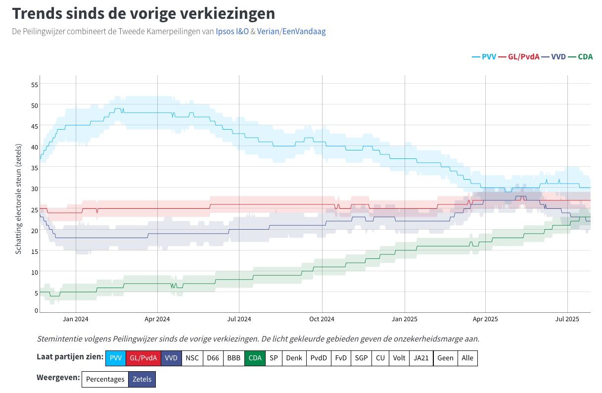 Dat de VVD het niet florissant doet in de peilingen is overduidelijk (daar kan Yesilgöz wellicht wat aan doen door deze vraag eens te beantwoorden die nu al de hele zomer in de brandende zon op de kampeertafel ligt te bederven). In de Peilingwijzer van Tom Louwerse die de peilingen van Ipsos I&O en Verian/EenVandaag combineert (De Hond wil helaas niet dat de site zijn data gebruikt), ziet dat er qua trend zo uit: