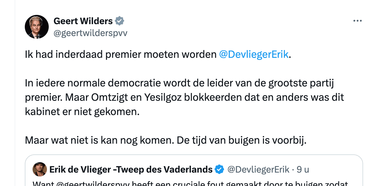 Wilders (voor het eerst tweede in peilingen) tweet: 'Ik had premier moeten worden, schuld van Omtzigt en Yesilgöz, wat niet is kan nog komen'