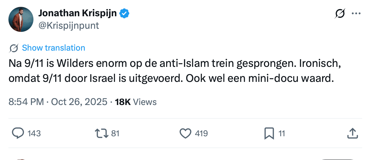 Hoe het is met Jonathan Krispijn, u weet wel, bekend van fietsendieven opsporen namens Ongehoord Nederland en Hart voor Humor (een podium waar hobbykomieken 3x heel hard 'neger' mogen roepen waarna de hele zaal zich een beroerte lacht, red.). Het pad van tamelijk onfrisse dommeling naar complete gek leek al ingezet toen hij rond een zoveelste coup bij ON ineens beweerde dat (inmiddels wijlen) toezichthouder Bauke Geersing een AIVD-infiltrant was. Inmiddels zijn we een paar maandjes verder en is Krispijn ontslagen bij de omroep (waarover meer in de aankomende GeenStijl Podcast) en gaat het allemaal nog verder bergafwaarts. Zo 'onthulde' hij laatst dat er in de Tweede Kamer, als alle camera's niet draaien, allemaal gemene dingen over Jezus worden gezegd, om later te 'onthullen' dat die onthulling over het Joodse PVV-Kamerlid Gidi Markuszower ging. Ahaaa, natuurlijk! U weet immers wie er verantwoordelijk waren voor de kruisiging van Jezus! Dezelfde verantwoordelijken als die van 7 oktober én NINE ELEVEN! Zucht.