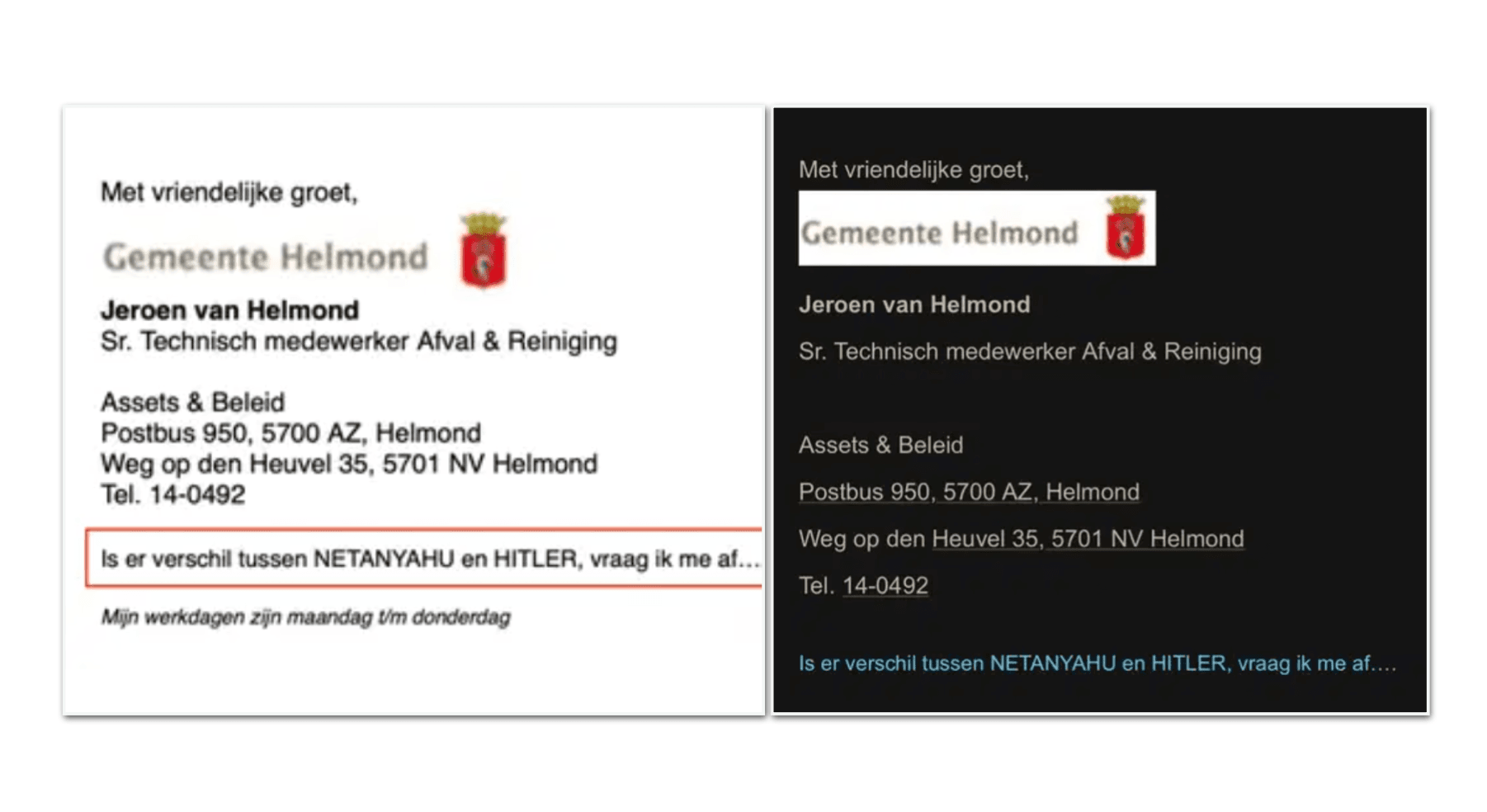 Gemeente Helmond berispt kliko-ambtenaar die mails afsluit met 'Netanyahu = Hitler'
