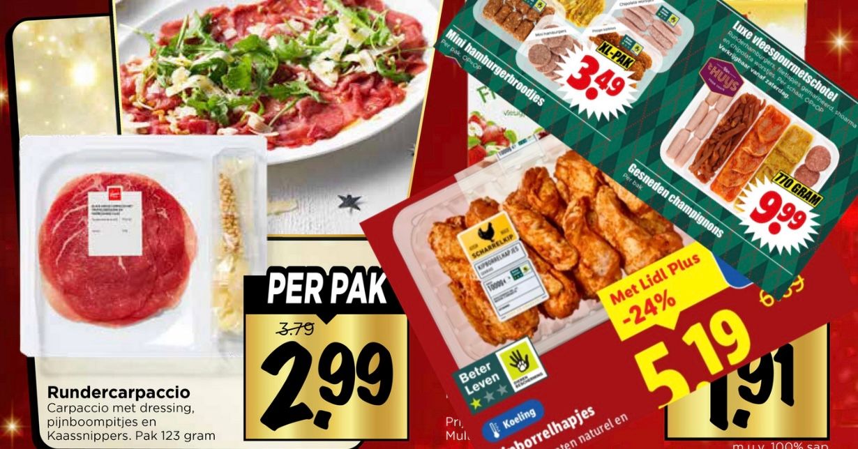 Alles wordt wel duurder, maar soms ook goedkoper, bijvoorbeeld als het in de aanbieding is. En voor iedereen die De Strijd Om De Gehaktbal En Andere Carnivore Zaken nog niet heeft opgegeven betekent dat, dat dit een extra fijne week is. Een meevallertje, na een jaar vol tegenvallers. Een stukje zilveren rand aan een donkere wolk. Je zou haast zeggen: de zon gaat weer schijnen in de boodschappenmand. Hoe dan ook, hier is het goede nieuws: "Supermarkten stunten in aanloop naar kerst ruim drie keer zoveel met vlees als in een gemiddelde week, meldt stichting Wakker Dier. De organisatie spitte de kerstfolders door van de tien grootste supermarktketens. Als het aan die bedrijven ligt, wordt dit jaar weer vooral veel gegourmet tijdens de feestdagen" Nou. Als het aan ons ligt ook! Bedankt voor de informatie, Wakker Dier!