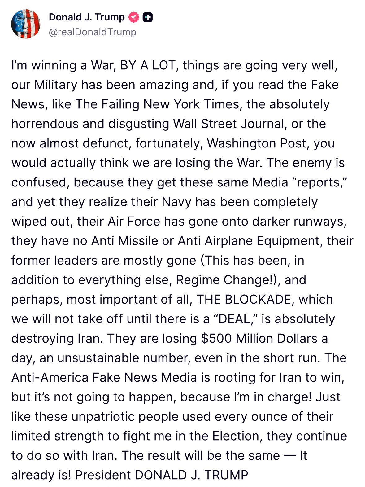 Nou u kent de mop van de Amerikaanse en Iraanse delegaties in Pakistan ze kwamen niet. Wat desondanks wel kwam: Trumps verlenging van de wapenstilstand, zonder dat Iran hier iets wezenlijks voor gedaan heeft. Dus het zal u niet verbazen: Iran vertrouwt het niet. Adviseur Mehdi Mohammadi van de Iraanse parlementsvoorzitter en eventjes de facto Iraanse leider Mohammed Ghalibaf schreef op Twitter: "Extending the ceasefire by Trump has no meaning. The losing side cannot dictate terms. Continuing the blockade is no different from bombing and must be met with a military response. Moreover, any extension of the ceasefire by Trump is certainly a way to buy time for a surprise attack. Now is the time for Iran to take the initiative." Tijd kopen voor een verrassingsaanval is natuurlijk wel exact wat Trump deed in de weken die voorafgingen aan de oorlog, en we mogen hopen dat Mohammadi gelijk heeft en de oorlog binnenkort gewoon keurig hervat wordt, al begint het onwaarschijnlijk te voelen. Maar dat voelde de oorlog als zodanig eerst ook, dus ja. Afijn, we gaan maar weer eens tankers turven en LIVE.