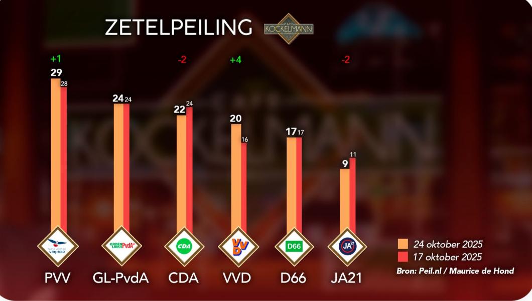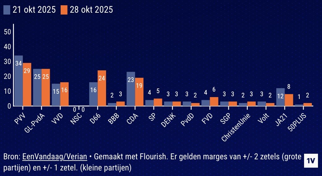 Zo dan, daar is de eerste van de laatste peilingen met AARDVERSCHUIVINGEN in het voordeel van Robbie Jetten. Die maakt een sprong van 8 zetels ten opzichte van de vorige EenVandaag-peiling. Allemaal over de rug van de Prinses van Oranje maar dan heb je ook wat. Geert Wilders zakt flink, maar ook het CDA van Bontenbal krijgt een klap. JA21 verliest er 4, die lijken te zijn weggesnoept door BBB en Forum. Het echte nieuws is natuurlijk dat 50PLUS STIJGT NAAR 2 ZETELS. Een ongelofelijke zegetocht voor Jan Struijs en de zijnen.