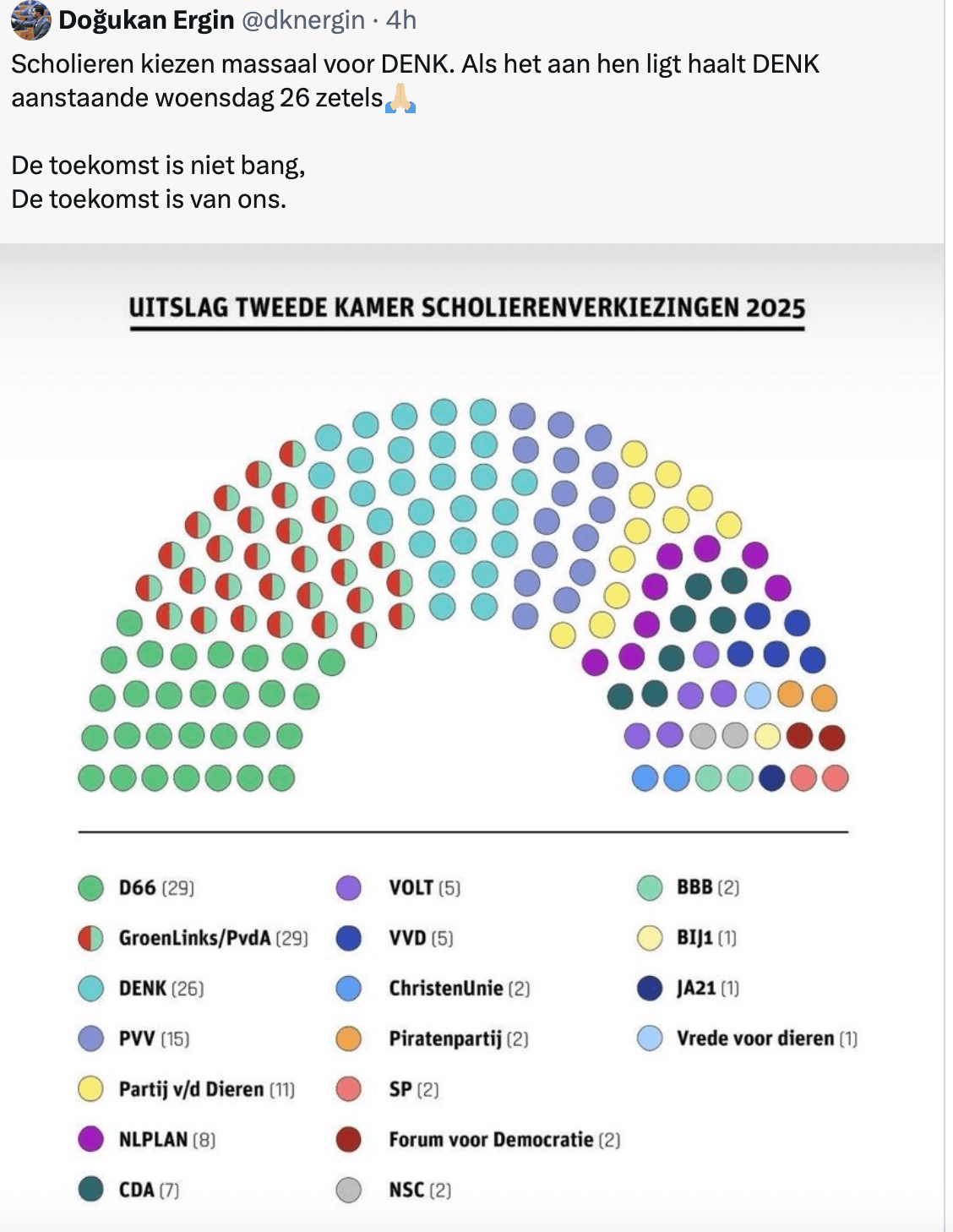 Zo, was dat ff schrikken. Ineens werd bovenstaand plaatje van de uitslag van de 'Scholierenverkiezing' de wereld in geslingerd door Doğukan Ergin, Kamerlid én nummer 2 van Denk. Er was wel iets opvallends aan de uitslag, namelijk dat Denk ineens ZESENTWINTIG zetels haalde bij puberend Nederland en dat CCP-tentakel NLPlan er 8 binnensleept. Wel ja, er zijn nu eenmaal veel fatbikejochies van die leeftijd en Kok Chan van NLPlan is onder kids een gigantische miem, dus wie weet. Veruit het grootste probleem is echter dat de Scholierenverkiezingen 2025 nog in volle gang zijn en organisator ProDemos de uitslag pas op 29 oktober bekendmaakt. In werkelijkheid gaat het hier om de uitslag van slechts 1 school, en wel het X11 in Utrecht. Dat was Ergin even vergeten te vermelden, sterker nog: die informatie was voor de gelegenheid van het plaatje afgeknipt. Zie volledig plaatje na de breek.