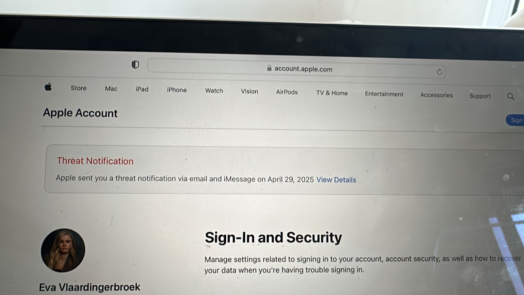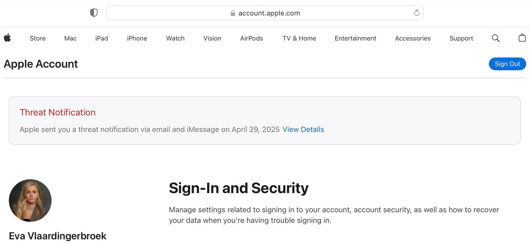 Als waterdichte verificatie van de echtheid van deze 'Apple threat notification' vraagt Apple de gebruiker: "To verify that an Apple threat notification is genuine, sign in to account.apple.com. If Apple sent you a threat notification, it will be clearly visible at the top of the page after you sign in." Onderstaand het resultaat.