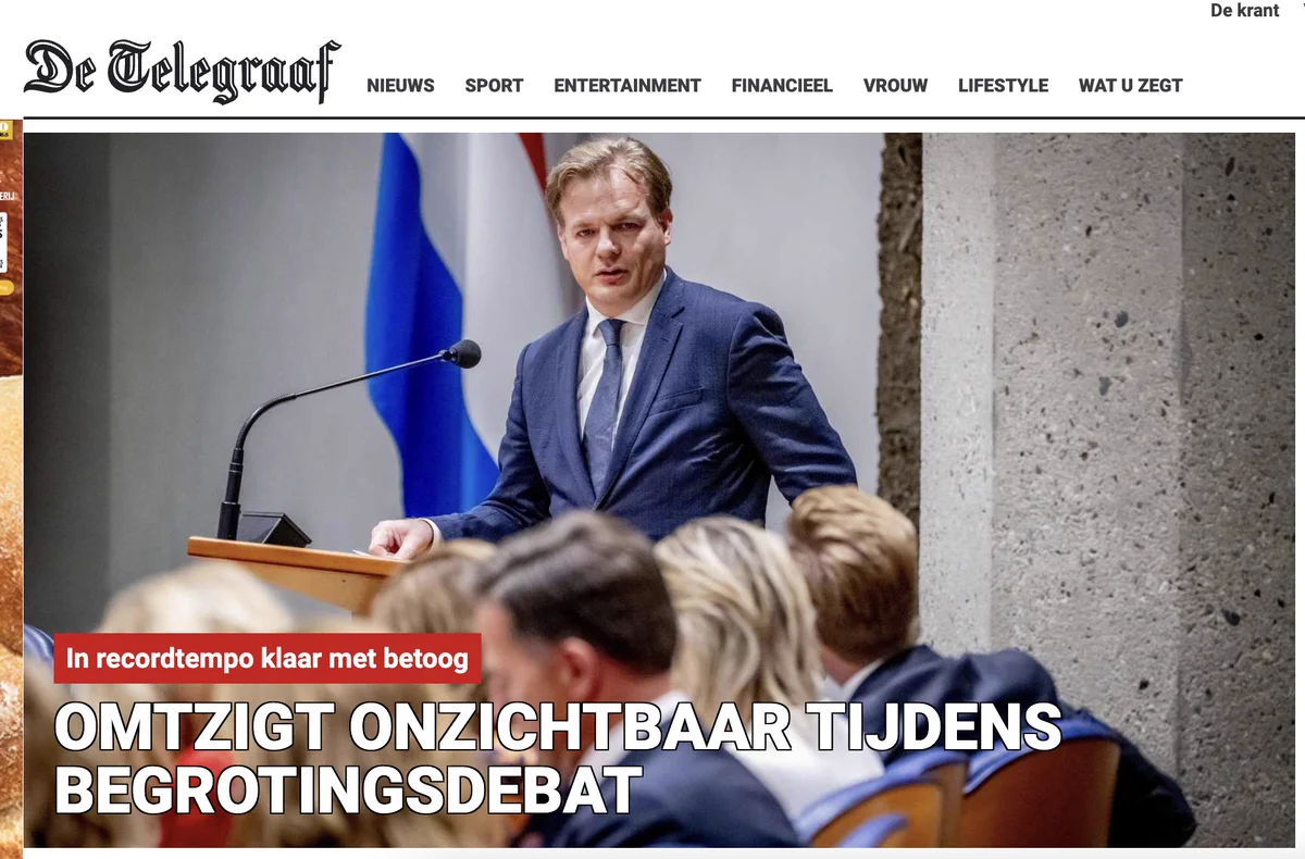 Hier verder met de Derde Donderdag in September in Den Haag, als die gemene dictator en ambtenarenverzamelaar Marx Rutte aan het woord komt voor een dagje pareren, wegmasseren, flagelleren, koeioneren, riposteren en wat je verder allemaal met een dienstauto kunt doen. Normaliter zouden wij adviseren op deze dag iets in de tuin te gaan doen danwel het schilderwerk van uw huis te reinigen, want APB Deel II is nog saaier alsdan een BNNVARA Cabaretavond met Alleen maar Vrouwen. Maar het is onwijs pokkeweer en dan ook de hele dag dus knippen we die ellendige livestream maar weer aan op ZINLOZE EXERCITIE24. Foto boven: Pieter Omtzigt gisteravond laat. Foto onder: Telegraaf vanochtend vroeg. Zo lopen de hazen. Sterkte allen.