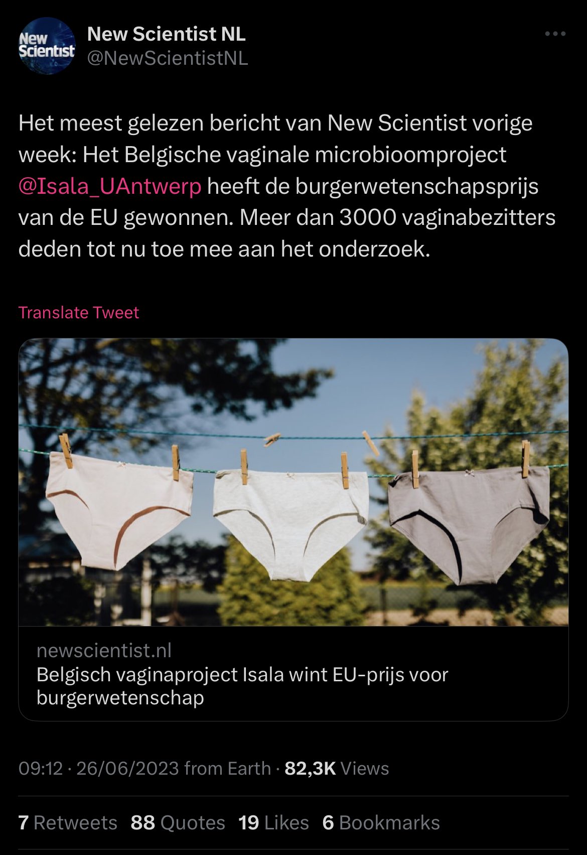 Meisjes! Dames! Vrouwspersonen! MEN heeft weer een nieuw titeltje bedacht om u tegelijkertijd te adresseren, en uit te gummen. We kenden al het wokistische "mensen met een baarmoeder", maar thans is er het tamelijke kapitalistisch klinkende "VAGINABEZITTER". Als je er fiscaal naar kijkt klinkt het aftrekbaar in box 3, maar socio-economisch beschouwd zou men ook een pooier kunnen bedoelen. Hoe dan ook ligt er altijd huurbeslag op, en goedkoop is duurkoop. De term is echter fiscaal noch sociaal, maar "wetenschappelijk" met dank aan New Scientist ("hét wetenschapsplatform vol ideeën die de wereld veranderen"), dat zijn bovenstaande tweet fluks uit de tijdlijn mutileerde nadat mensen vraagtekens stelden bij "vaginabezit". Want je kan voor het uiterlijk vertoon en het flaneren in matig verlichte ruimtes met een scalpel wel een mooie voeg snijden van een snikkel, dat maakt het nog geen gezonde zuurhoudende kweekruimte voor schimmels, bacteriën en aanverwante levende organismen en dat verschil zouden wetenschappers toch moeten kennen - zelfs new scientists. Afijn, wie zijn peer review over het woord 'vaginabezitters' in hen pruim wil peren, de comments staan (nog heel even) open...