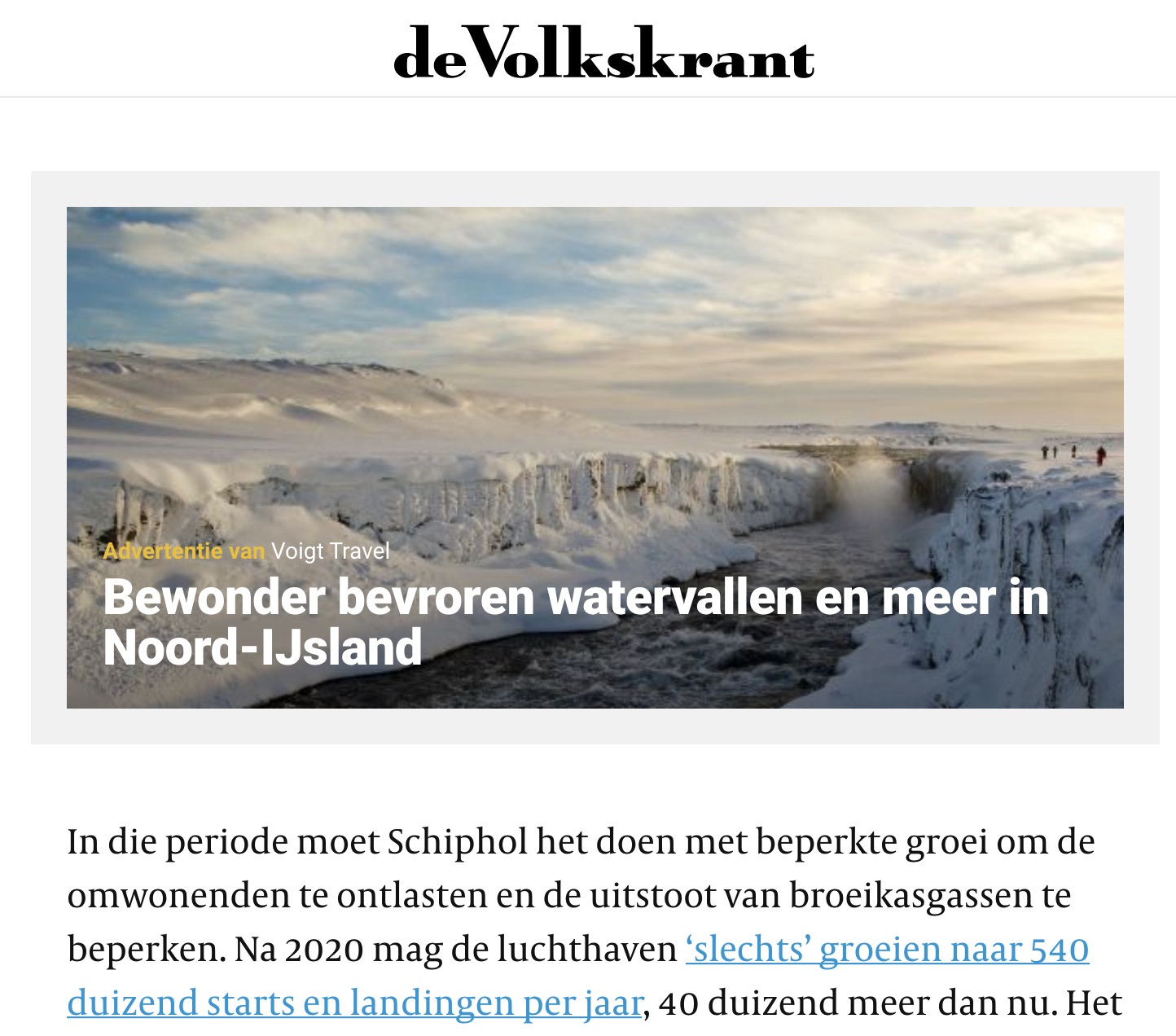 Het moet afgelopen zijn met de vele advertenties voor vliegvakanties in de Volkskrant. Dat staat in een concept "luchtvaartnota" die in handen is van de Volkskrant, dat vandaag maar een totale treiteradvertentie voor een moorddadige vliegvakantie naar Noord-IJsland bij het online bericht plaatste. Zie screenshot.