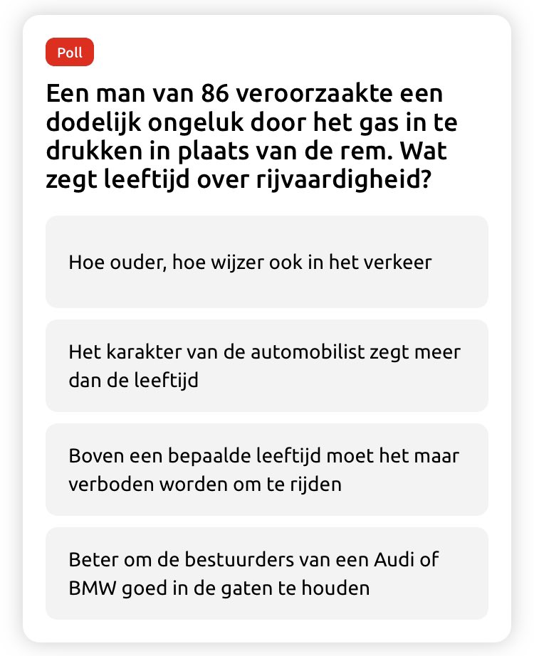 Een man van 86 heeft een fietser van 72 doodgereden en toen dacht Professor Pageview van Omroep Brabant kennelijk: goh laten we daar eens een gezellig polletje onder kwakken. "Wat zegt leeftijd over rijvaardigheid?" Heel veel natuurlijk en dan krijg je vier keuzemogelijkheden uit de hemel. 'Hoe ouder, hoe wijzer, ook in het verkeer'. De Amerikaanse toppolitici schijten van ellende hun eigen luier vol, komen niet meer uit hun woorden en vallen dood neer achter het katheder, maar hoe ouder hoe wijzer, ook in het verkeer! En: 'Het karakter zegt meer'. Opa heeft een staar, donderde vanochtend van de trap, is kleurenblind en kan links niet meer van rechts onderscheiden, maar hij heeft zojuist nog drie euro overgemaakt naar Cordaid. RIJDEN MAAT! En: 'Beter bestuurders van Audi en BMW in de gaten houden'. Daarmee doelt Omroep Brabant op asotokkies en scheurmocro's, die rijden vaak in gehuurde Mercedes of opgefokte Golf, maar ja. Bovendien weet iedereen dat we toch vooral bestuurders van de Dacia Logan en de Renault ZOE in de gaten moeten houden want WAT IS ER MIS MET JE. Blijft over 'boven een bepaalde leeftijd moet het maar verboden worden om te rijden' en dat is geen antwoord maar een stelling. DUS: