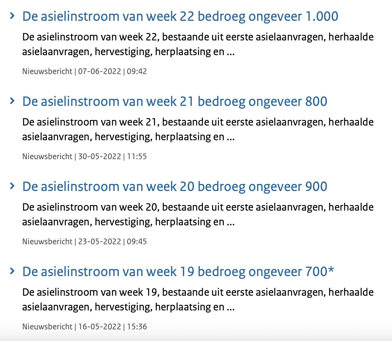Slecht nieuws. De Immigratie en Naturalisatie Dienst (ook wel bekend als het D66-orgaan IND) heeft in week 22 De Omvolking van Het Gave Land Nederland opgevoerd met PLUS DUIZEND (+1000). Na weken van ellendige berichten in de media over mensen die op stoelen moeten slapen, over mensen die in het gras bij een hek liggen, foto's van Rutte in Ter Apel: "PIJNLIJK ZICHTBAAR DAT ASIELOPVANG OVERVOL IS" worden de cijfers niet minder, maar meer meer. De Omvolkingstheorie - waar we van de heer SS van D66 niet over mogen praten - is inmiddels Omvolkingspraktijk want anders kunnen we het niet verklaren waarom de import van parallelle samenlevers op weg naar de bijstand (pdf) is TOEGENOMEN.