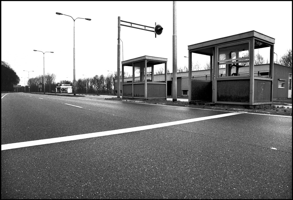 FOTOBIJSCHRIFT: Nederland, Beek Ubbergen, 15-10-1995. Voormalige grensovergang, grenspost bij Nijmegen. Sinds maart 1995 treedt het verdrag van Schengen in werking waardoor de binnengrenzen tussen een aantal landen in Europa verdwijnen. Dit moet het economisch verkeer tussen deze landen vergemakkelijken