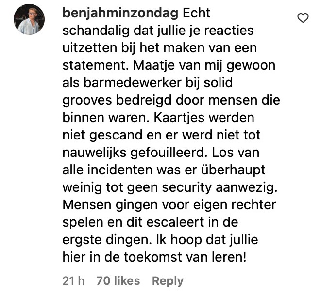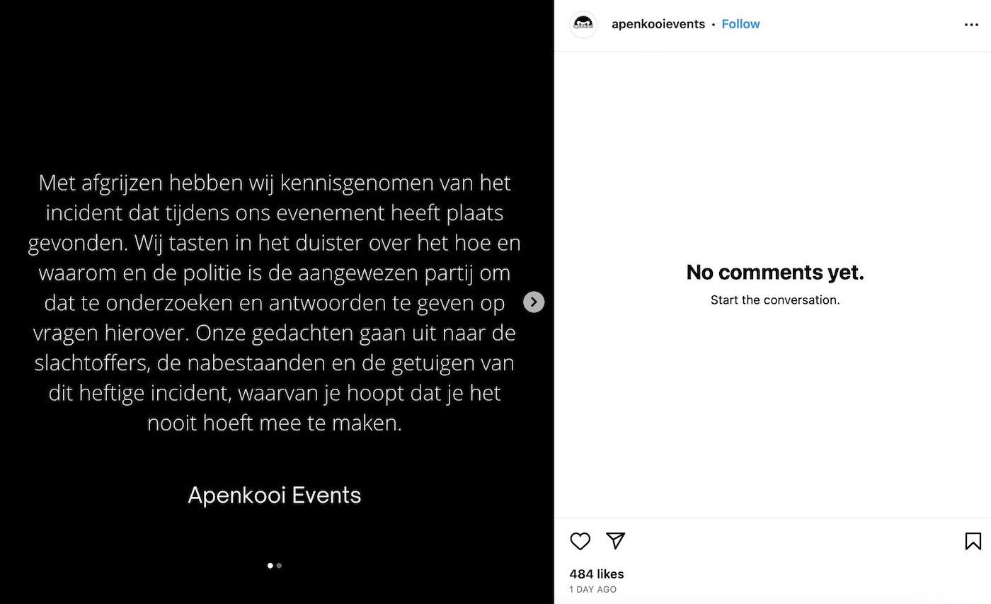 Bindend tipje voor de social media manager van Apenkooi Events, de organisator van het housefeest waar afgelopen zondag een grote vecht- en steekpartij uitbrak waardoor één man stierf en twee anderen in het ziekenhuis belandden: als je geen kritiek wenst, moet je wel bij alle Instagramposts je reactiemogelijkheid uitzetten en niet alleen bij je slappe statement. Want waar jullie "in het duister tasten over het hoe en waarom", zetten de bezoekers bij een ander bericht een spotlight op de problemen van die dag. Zo werd er amper gefouilleerd, schitterde de beveiliging door afwezigheid, stond de achterdeur open dankzij omgekochte portiers, werden bezoekers beroofd en het barpersoneel bedreigd en was de sfeer grimmig, zo lezen we in de anekdotes van betrokken feestbeesten. Dat wetende is het plots niet zo verbazingwekkend dat het zo grandioos uit de hand liep. Iedereen kon naar binnen en op drugs en wapens werd nauwelijks gecontroleerd. "Ik ben niet gefouilleerd bij binnenkomst, rugtas kon zo zonder kijken mee naar binnen, terwijl ik er mijn verbazing over uitspreek bij de beveiliging zeggen ze dat ik snel moet doorlopen", aldus ene Charlene. Dan kunnen jullie wel in het duister tasten, maar als je zo de deur wagenwijd openzet, dan moet je niet verbaasd zijn als de problemen binnenwandelen.