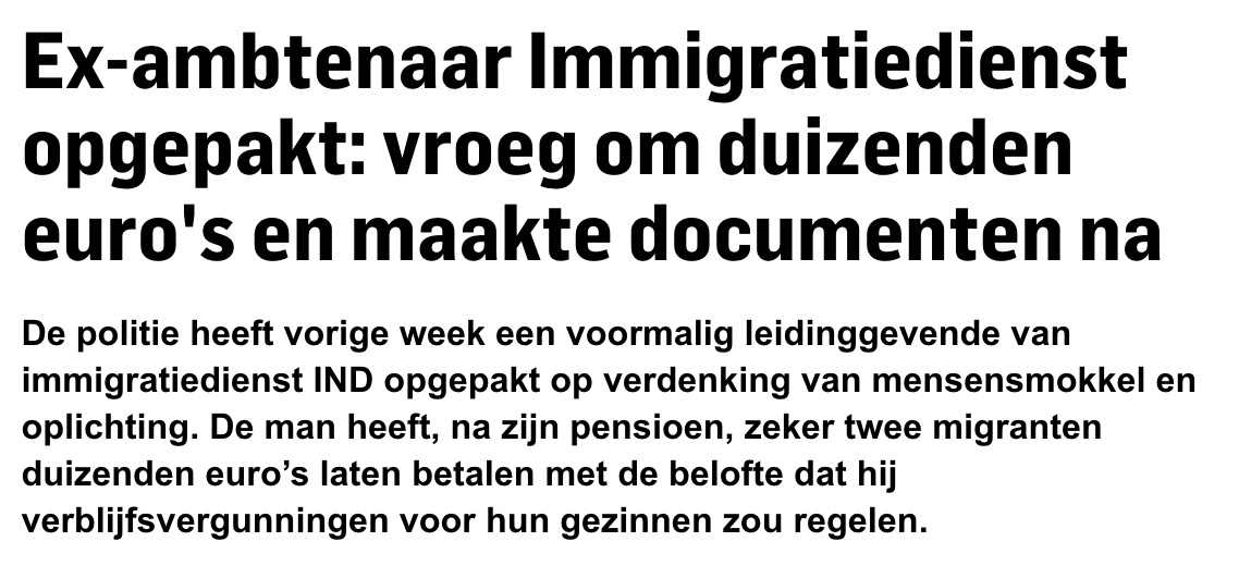 Het verbaast uiteraard geenszins dat in een totaalcorrupte narcostaat waar de CBS-cijfers niet kloppen, popprijzen aan openlijke cokesnuivers worden gegeven, woningen + Mieles aan reeds bekende IS-kopstukken worden uitgedeeld, en het Algemeen Dagblad een krant wordt genoemd dat IND-ambtenaren documenten vervalsen en slapend rijk worden van woekerprijzen voor verblijfsvergunningen. En dan vergeten we ook nog wel wat. Zoals een minister-president van de VVD die maar blijft roepen dat hij iets aan de asielinstroom gaat doen. Echt nie.